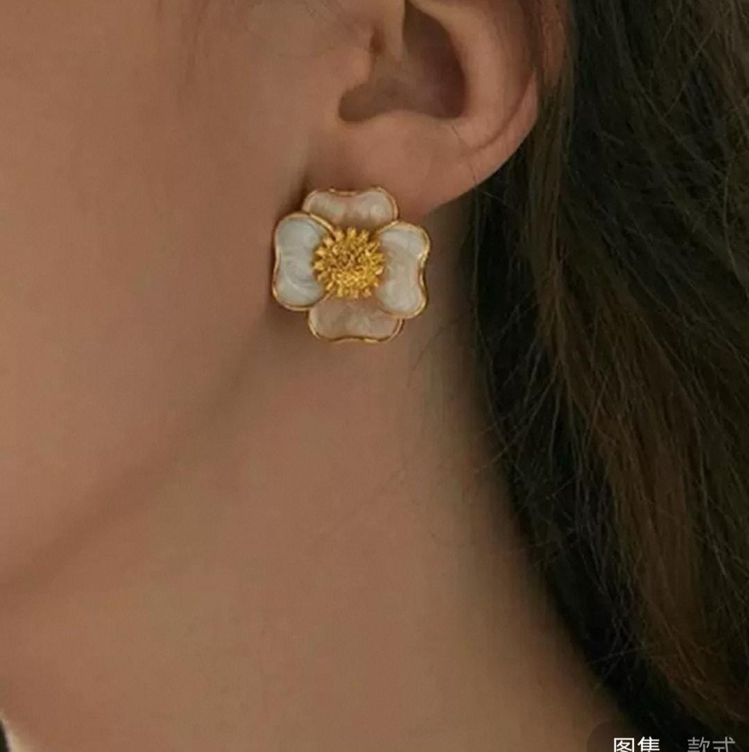 Product details of IKEAPK Elegant White Flower Stud Earrings for Women | Gold Plated Petal Design Earrings | Korean Fashion Jewelry Gift